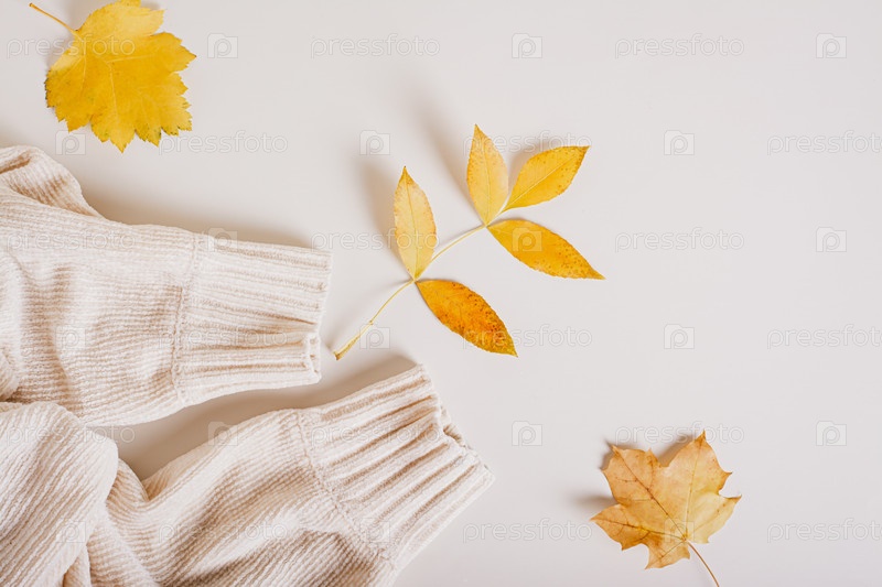 Уютный теплый осенний вязаный свитер с рукавами и желтыми листьями, вид сверху