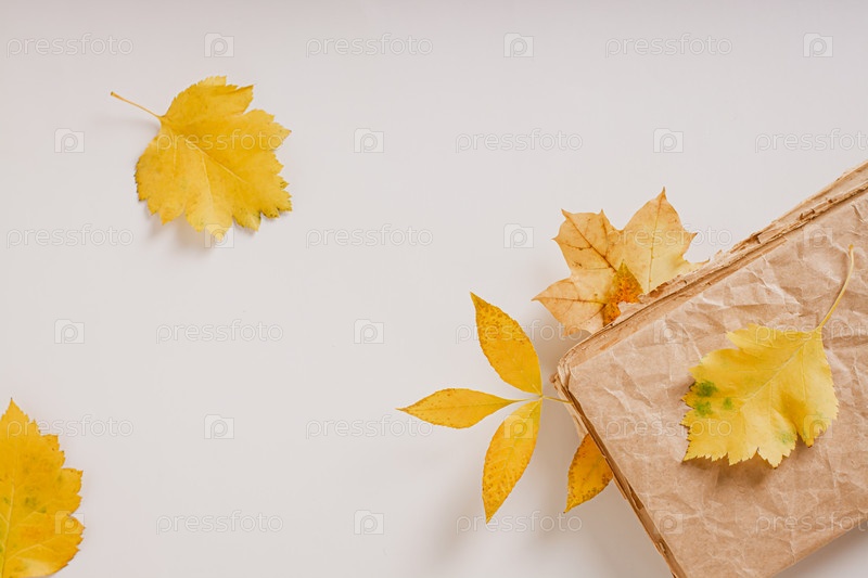 Уютное осеннее чтение старой книги и желтых листьев, вид сверху
