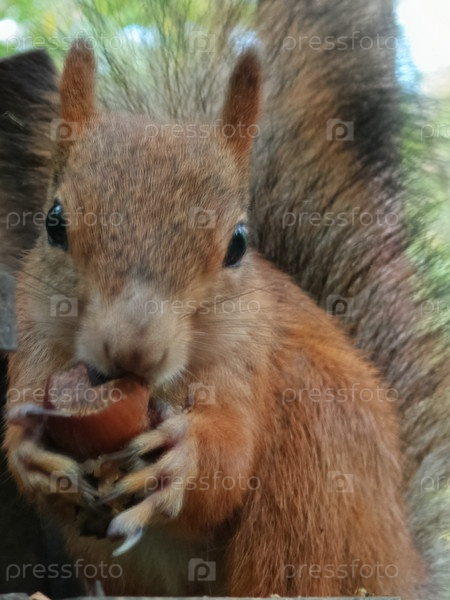 Белка-пушистый хвост крупным планом смотрит прямо в глаза с фундуком