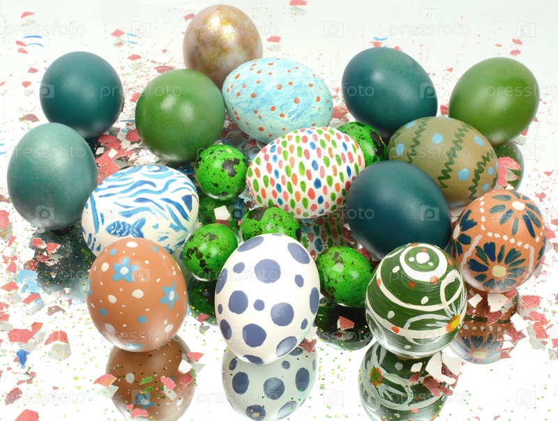 Красочно раскрашенные пасхальные яйца на отражающей поверхности