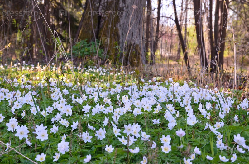 Белая ветрянка или Анемона (лат. Anemone) на солнечной лесной равнине