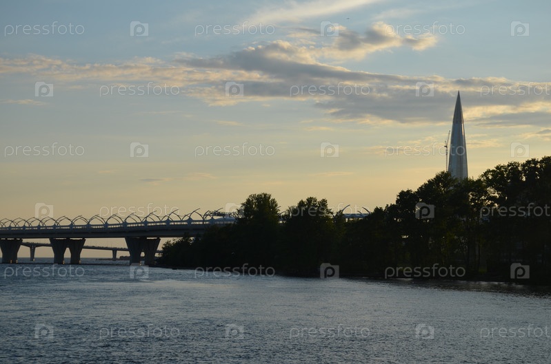 Вид на строящийся Лахта центр, ЗСД и яхтенный мост в устье Большой Невки в Санкт-Петербурге