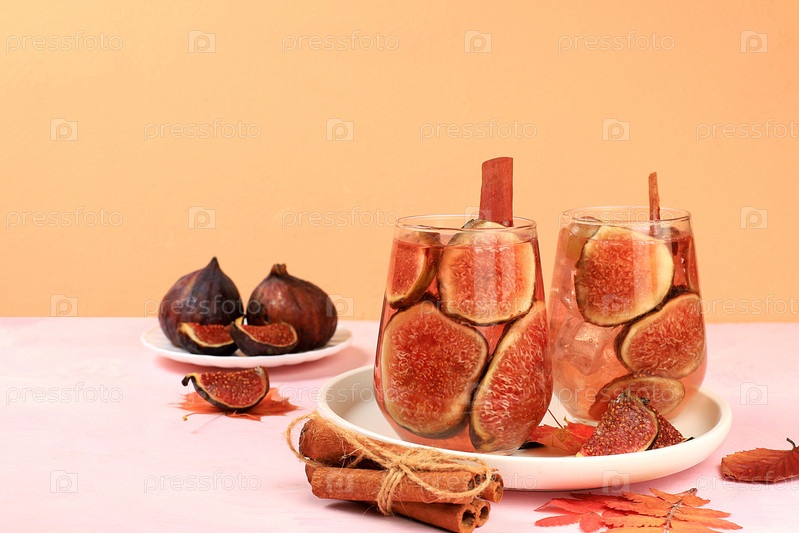 Коктейль с инжиром, корицей, виноградом на светлом фоне с осенними листьями, согревающий витаминный алкогольный и безалкогольный напиток в сезон гриппа и простуды, грог, сидр, лимонад. Концепция детокс-диеты, избирательный фокус