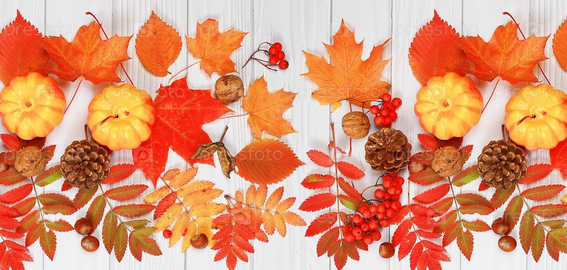 Осенняя абстрактная композиция с кленовыми листьями, сосновыми шишками, орехами, тыквами и ягодами рябины, натюрморт, концепция Дня благодарения, сезонный фон, баннер или заставка, поздравительная открытка или приглашение, выборочный фокус