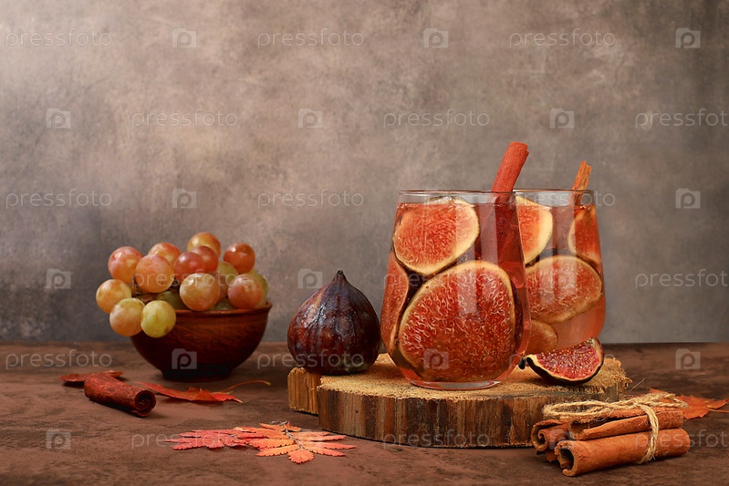 Коктейль с инжиром, корицей, виноградом на темном фоне с осенними листьями, согревающий витаминный напиток в сезон гриппа и простуды, алкогольный и безалкогольный грог, сидр, лимонад. Концепция детокс-диеты, избирательный фокус