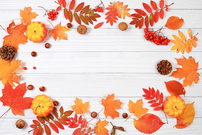 Рамка с кленовыми листьями, сосновыми шишками, орехами, тыквами и ягодами рябины, осенняя абстрактная композиция, концепции Дня Благодарения, сезонный фон, баннер или заставка, поздравительная открытка или приглашение с местом для текста, выборочный фокус