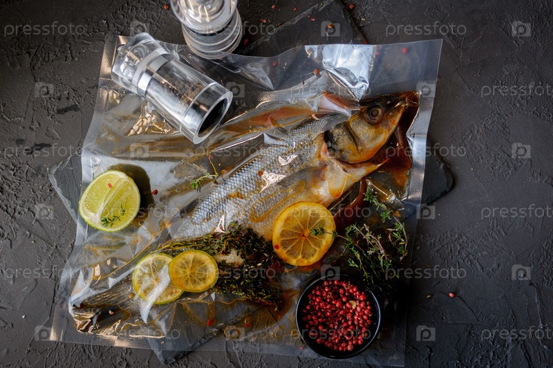 Сырая рыба морского окуня со специями и травами на черном фоне