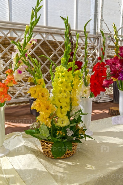 Букет из красивых желто-зеленых гладиолусов. Выставка гладиолусов в оранжерее Аптекарского Огорода (филиал ботанического сада МГУ). Москва