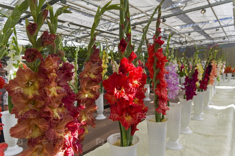 Букеты из красивых разноцветных гладиолусов. Выставка гладиолусов в оранжерее Аптекарского Огорода (филиал ботанического сада МГУ). Москва