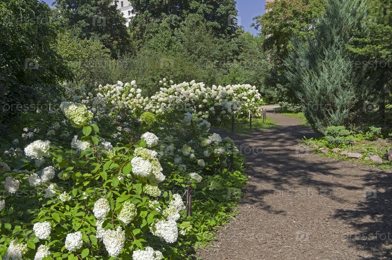 Кусты цветущей белой гортензии. Аптекарский Огород (филиал ботанического сада МГУ). Москва. Август, солнечно
