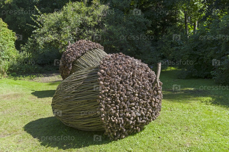 Забавные парковые скульптуры, сделанные из веток деревьев и сосновых шишек - гигантские желуди. Аптекарский Огород (филиал ботанического сада МГУ). Москва