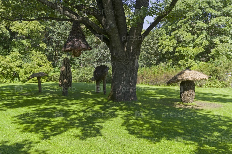 Забавные парковые скульптуры, сделанные из веток деревьев - огромные грибы. Аптекарский Огород (филиал ботанического сада МГУ). Москва. Солнечный день в августе