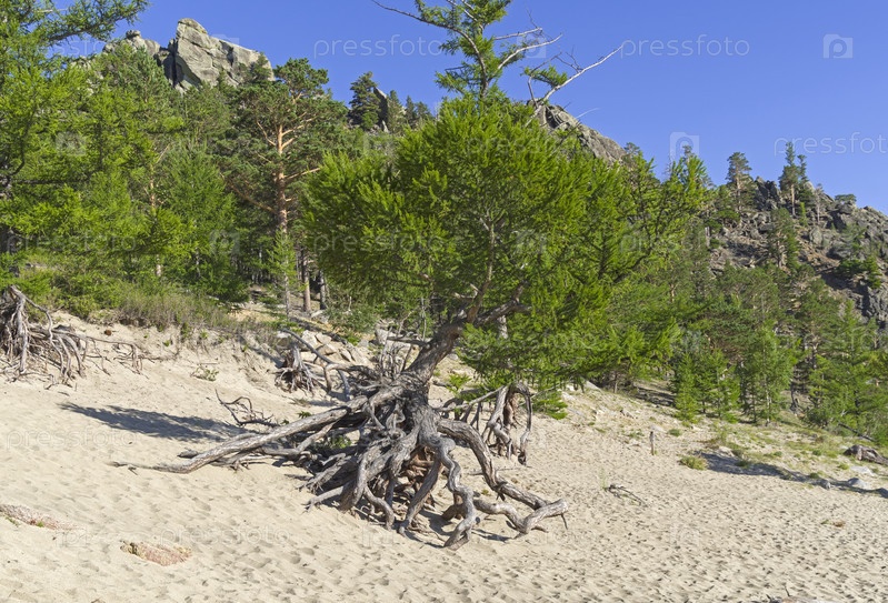 Памятник природы - ходульные деревья. Результат выветривания почвы. Бухта Песчаная, Большая Байкальская тропа. Озеро Байкал. Иркутская область, Россия. Август