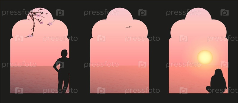 Силуэт пары под арками на фоне моря и неба, векторная иллюстрация морского пейзажа и нежного заката, висящая ветвь сакуры под сводами храма