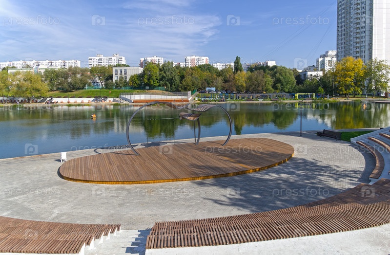 Летний театр на берегу Большого Коньковского пруда - сцена и расположенные амфитеатром скамейки для зрителей. Москва, Юго-западный административный округ, улица Введенского. Солнечный день в сентябре