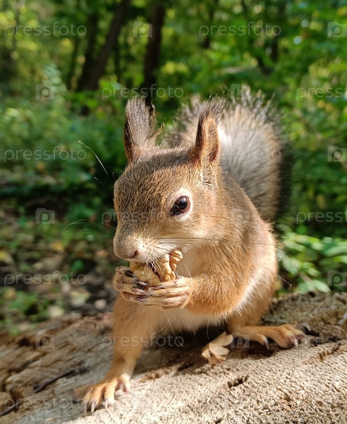 Бельчонок сидит на пеньке солнечным днем держи орех очищенныйт зубами и лапками