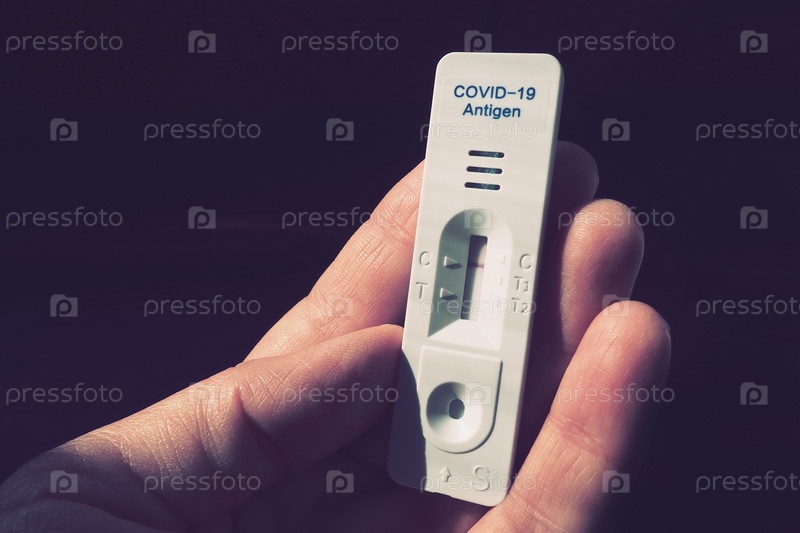 Результат теста на COVID-19 отрицательный, не зараженный, с использованием оборудования для экспресс-тестирования. Тест на коронавирус на руке, темный фон. Копирование пространства. Концепция тестирования на коронавирусную инфекцию