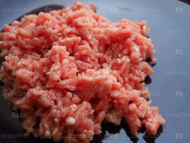 Фарш на большой фиолетовой керамической тарелке. Вкусный свежий фарш для приготовления котлет, стейков, гамбургеров, фрикаделек. Полуфабрикаты из свинины