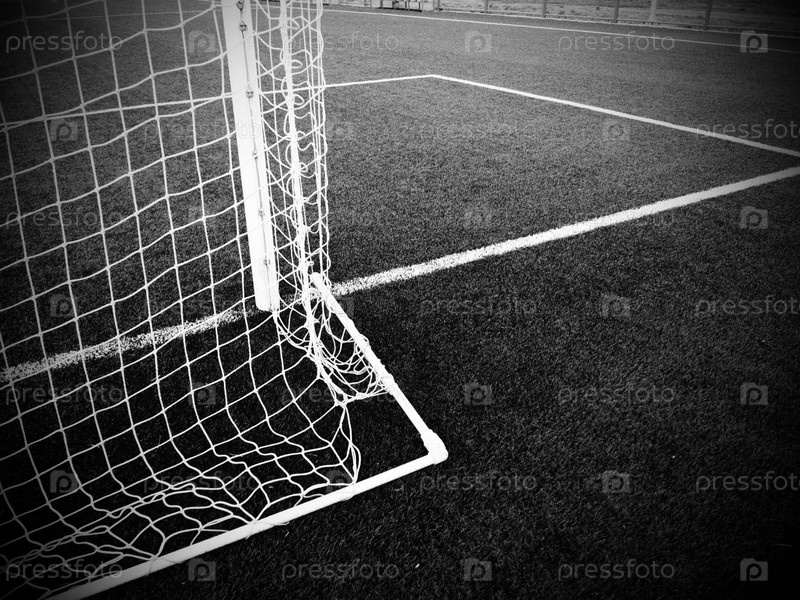 Сетка футбольных ворот с травяным фоном. Разметка и полосы футбольного поля