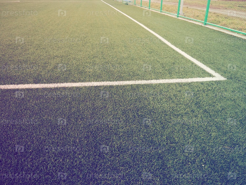 Разметка футбольного поля на зеленой траве. Белые линии шириной не более 12 см или 5 дюймов. Площадь футбольного поля. Боковые линии, линии ворот. Солнечные блики. Цвет и световой градиент