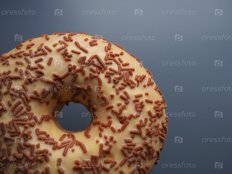 Пончик или пончик. Разновидность дрожжевого жареного теста. Сладкая закуска, которую можно приготовить дома или купить в пекарнях, супермаркетах, продуктовых ларьках. Вкусный пирог с легкой глазурью на темно-сером фоне