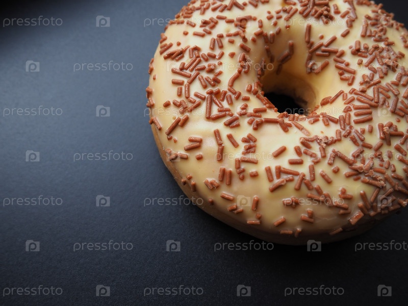 Пончик или пончик. Разновидность дрожжевого жареного теста. Сладкая закуска, которую можно приготовить дома или купить в пекарнях, супермаркетах, продуктовых ларьках. Вкусный пирог с легкой глазурью на черном или сером фоне