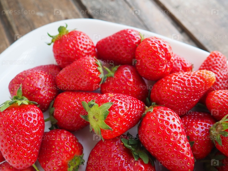 Клубника на тарелке, деревянном фоне. Белая посуда и вкуснейшая красная крупная садовая клубника. Здоровое питание, витамины и вегетарианская диета. Натюрморт с едой. Копирование пространства. Плоская планировка