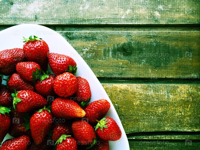 Клубника на тарелке, деревянном фоне. Белая посуда и вкуснейшая красная крупная садовая клубника. Здоровое питание, витамины и вегетарианская диета. Натюрморт с едой. Копирование пространства. Плоская планировка