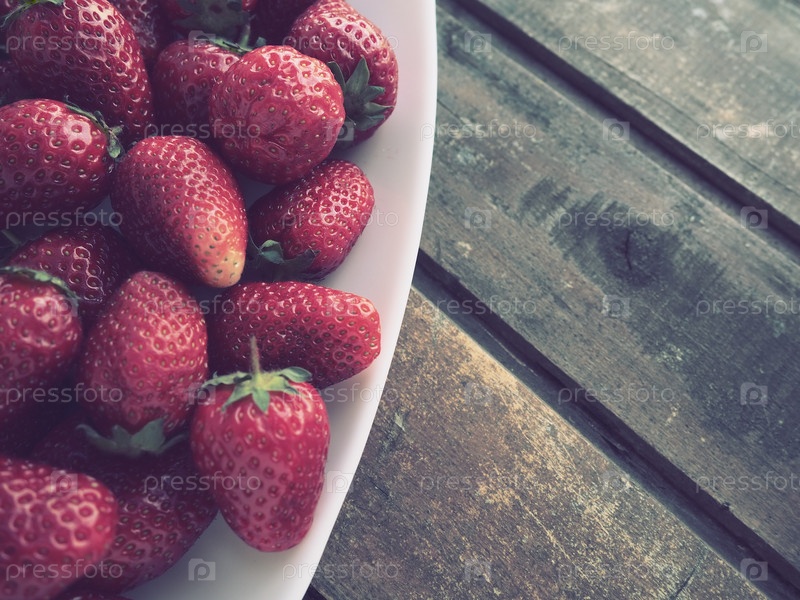 Клубника на тарелке, деревянном фоне. Белая посуда и вкуснейшая красная крупная садовая клубника. Здоровое питание, витамины и вегетарианская диета. Натюрморт с едой. Копирование пространства. Плоская планировка