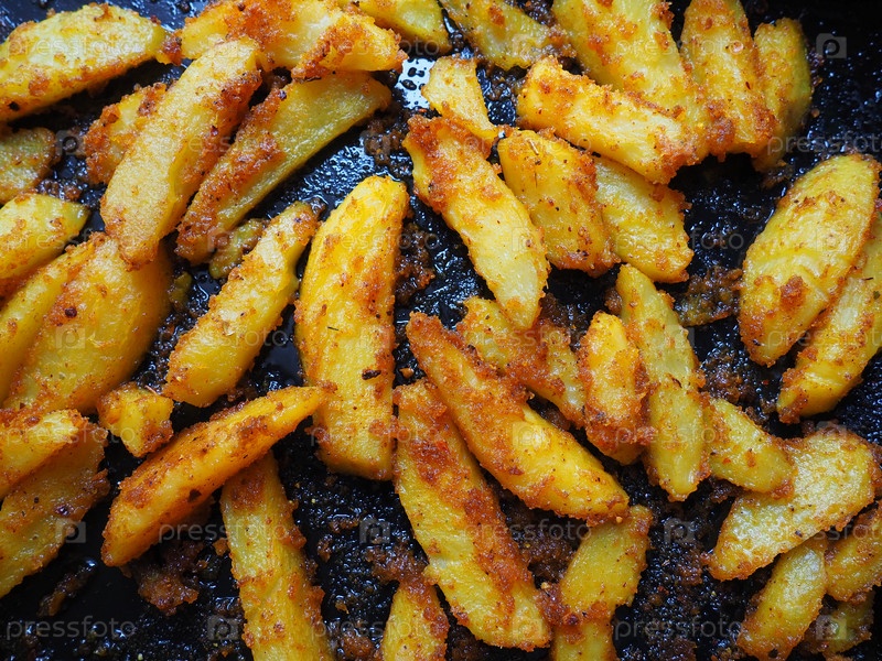 Жареный картофель или картофель фри с куркумой, карри и панировочными сухарями. Крупный план. Вкусный гарнир. Пекарский картофель. Латиноамериканская или бельгийская кухня. Еда на черном противне из духовки