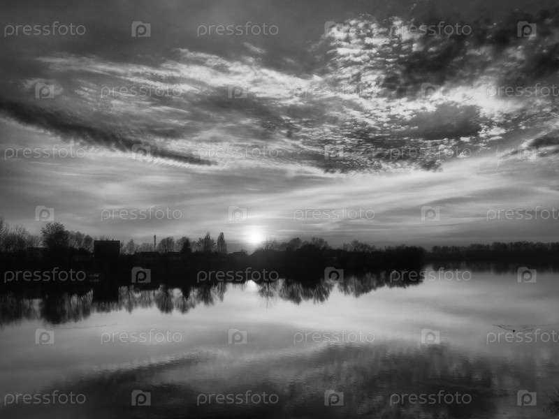 Очень красивый закат над водой. Берег реки и горизонт. Заходящее солнце. Черно-белая фотография с повышенной контрастностью. Драматическое небо и облака. Наступление ночи. Кучевые и перистые облака