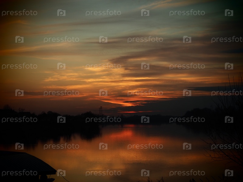 Очень красивый закат над водой. Берег реки и горизонт. Яркие облака нарисованы зашедшим за горизонт вечерним солнцем. Красное оранжево-синее драматическое небо и облака. Размытый туманный фокус