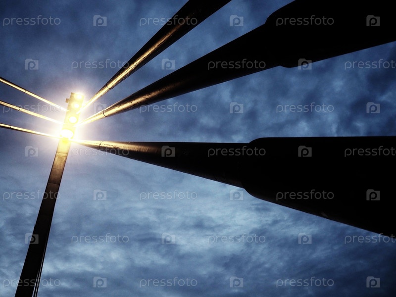 Прожекторы на мосту. Переносная светодиодная осветительная башня. Пешеходный мост Святого Иринея через реку Сава, Сремска-Митровица, Сербия. Вечернее голубое небо с облаками. Металлические столбы и балки, перспектива