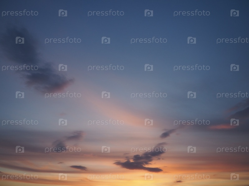 Красивый закат. Разноцветные светлые облака в лучах заходящего солнца. Перья и кучевые облака. Хорошая погода. Розовый, оранжевый, красный, желтый градиент неба