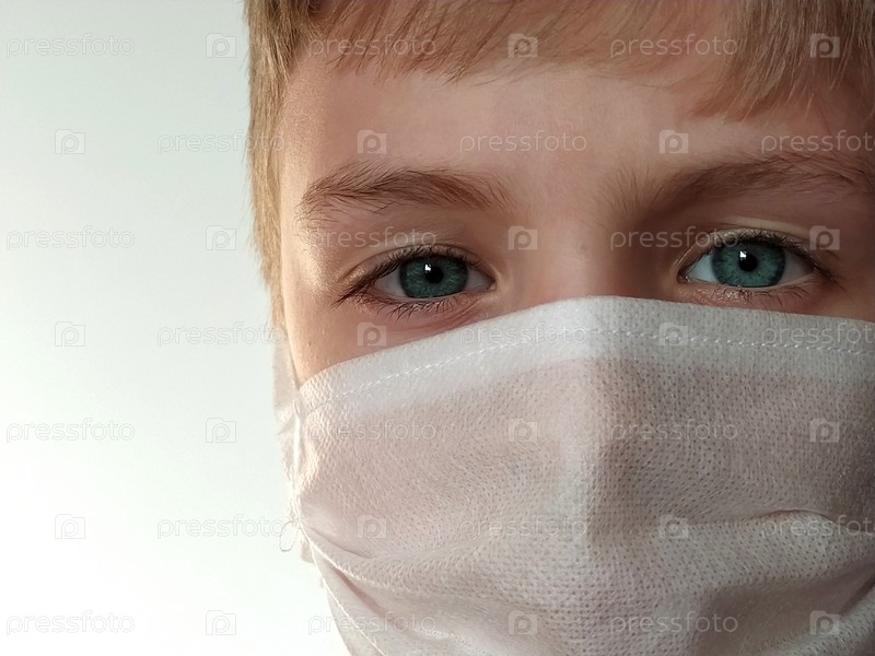 Ребенок в маске. Лицо 7-летнего мальчика в защитной белой хирургической маске крупным планом. Школьник со светлыми волосами и серо-голубыми глазами на белом фоне