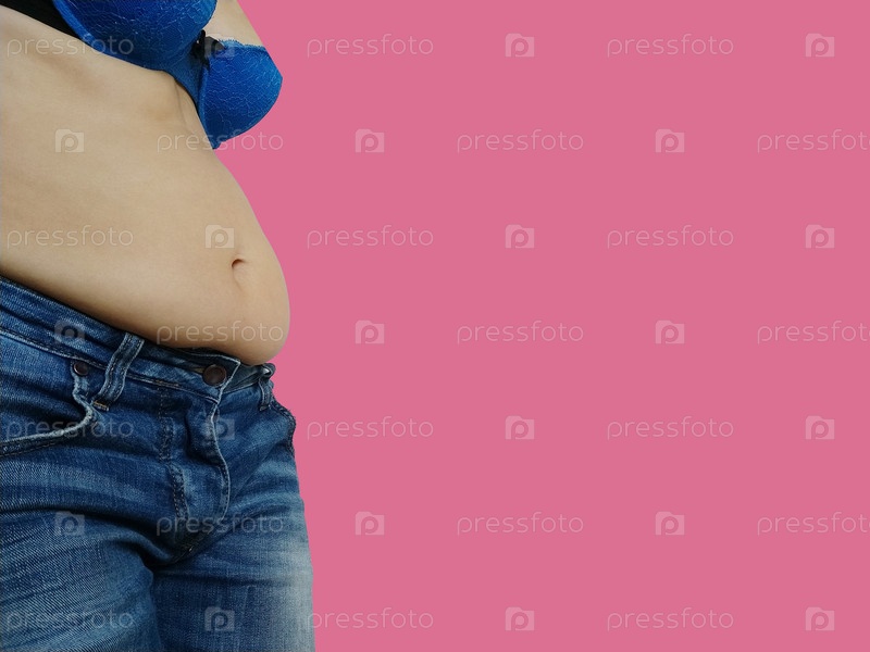 Обвисший живот. Складки кожи и жира по бокам свисают над талией джинсов. Фигура, испорченная перееданием или беременностью. Ожирение и диабет