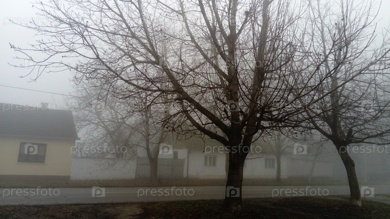 Поздняя осень или зима в сербской деревне. Густой туман окутал сельскую местность. Черные силуэты поваленных деревьев На улице никого. Старый дом и дорога, едва видимые из-за испарения