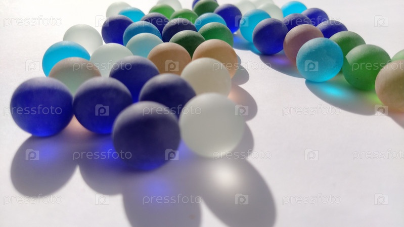Игровые кликеры или цветные стеклянные шарики, разбросанные по белому фону. заднее освещение