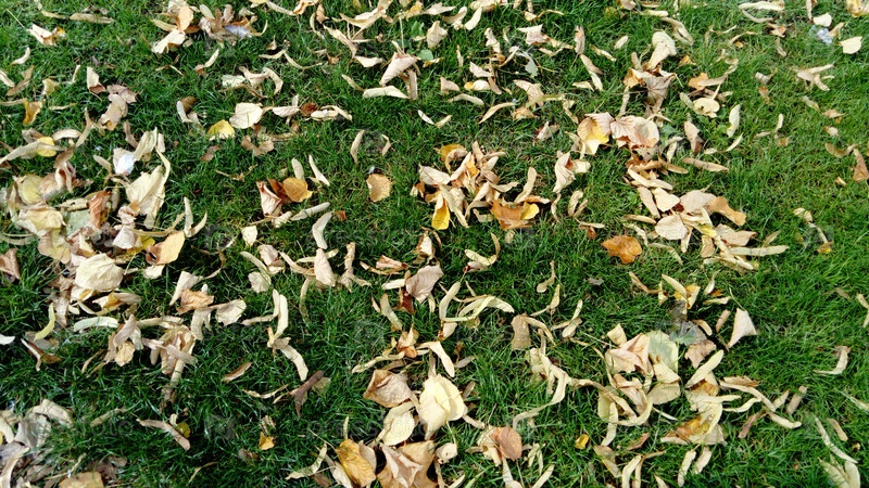 Осенний листопад в парке. Сухие желто-коричневые листья деревьев упали на еще зеленую траву. Ранняя осень