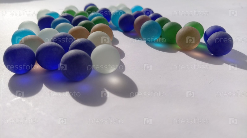 Игровые кликеры или цветные стеклянные шарики, разбросанные по белому фону. задняя подсветка