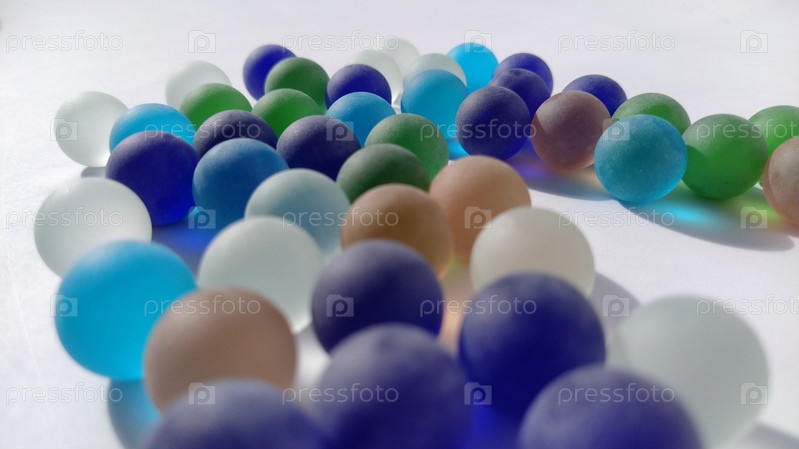 Игровые кликеры или цветные стеклянные шарики, разбросанные по белому фону. заднее освещение
