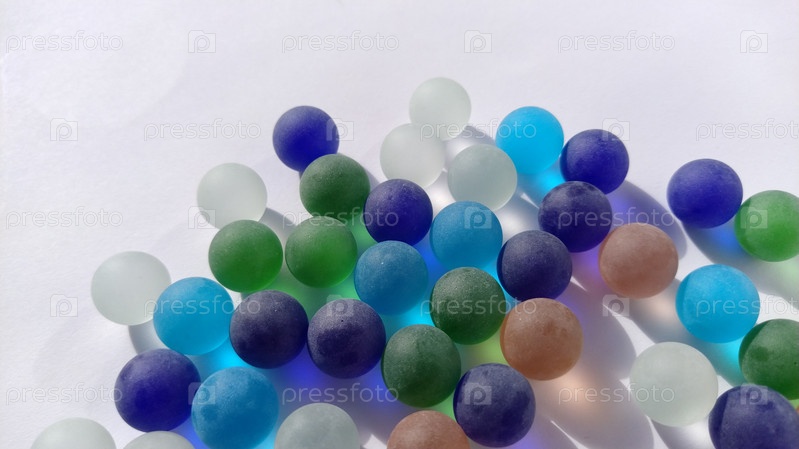 Игровые кликеры или цветные стеклянные шарики, разбросанные по белому фону. заднее освещение