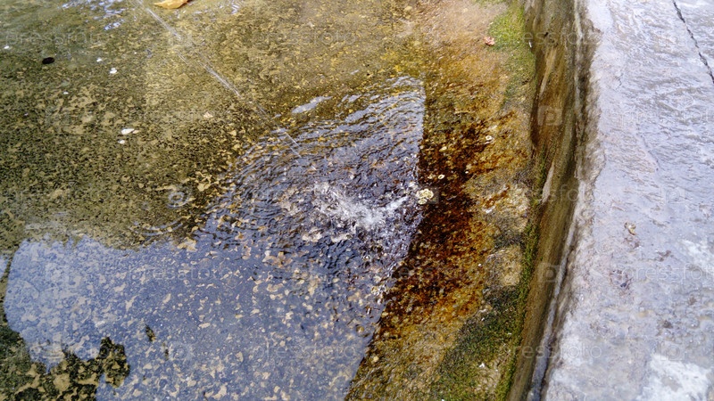 Старый фонтан в центре города. Туда же льется тонкая струйка воды, которая поменяла цвет на ржавый. Отражение неба в воде