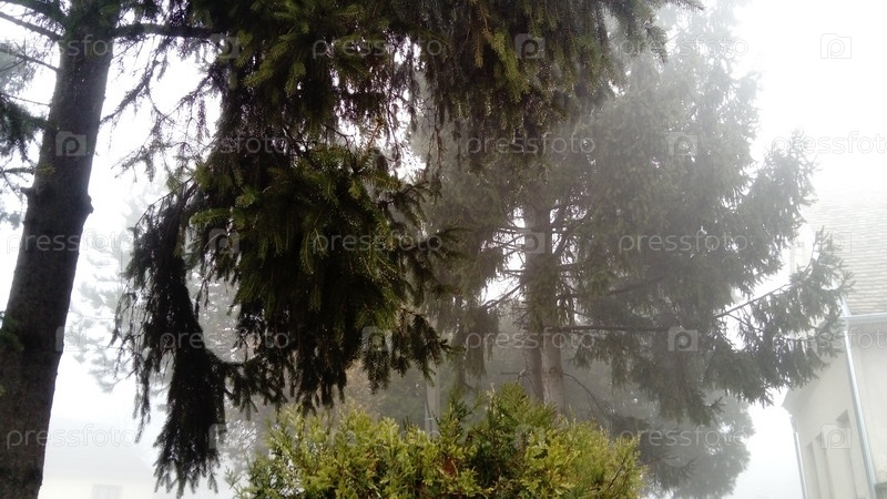 Ветви Туи, фоновое зеленое дерево. Красивые ветки ели в тумане