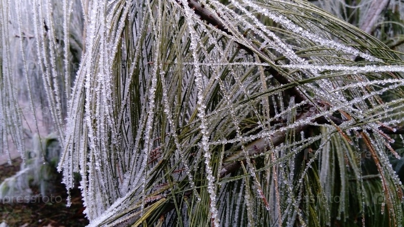 Красивые длинные сосновые иголки с белым инеем. Замороженные ветки вечнозеленого растения. Деревья замерзли в страшный мороз. Кристаллы льда образовались из-за высокой влажности