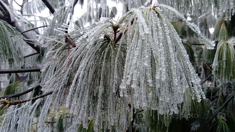 Красивые длинные сосновые иголки с белым инеем. Замороженные ветки вечнозеленого растения. Деревья замерзли в страшный мороз. Кристаллы льда образовались из-за высокой влажности