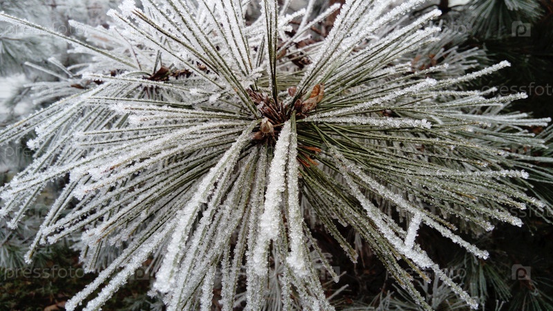 Красивые длинные сосновые иголки с белым инеем. Замороженные ветки вечнозеленого растения. Деревья замерзли в страшный мороз. Кристаллы льда образуются из-за высокой влажности