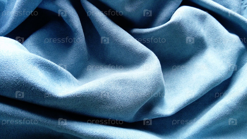 Приятная на ощупь бархатистая ткань голубого цвета, мнущаяся и укладывающаяся волнами под естественным светом