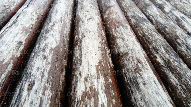 Строительный бревно для использования в строительстве без продольной распиловки. Ассортимент круглого леса. Фрагмент конструкции из оцилиндрованных деревянных бревен. Влияние влаги на древесину