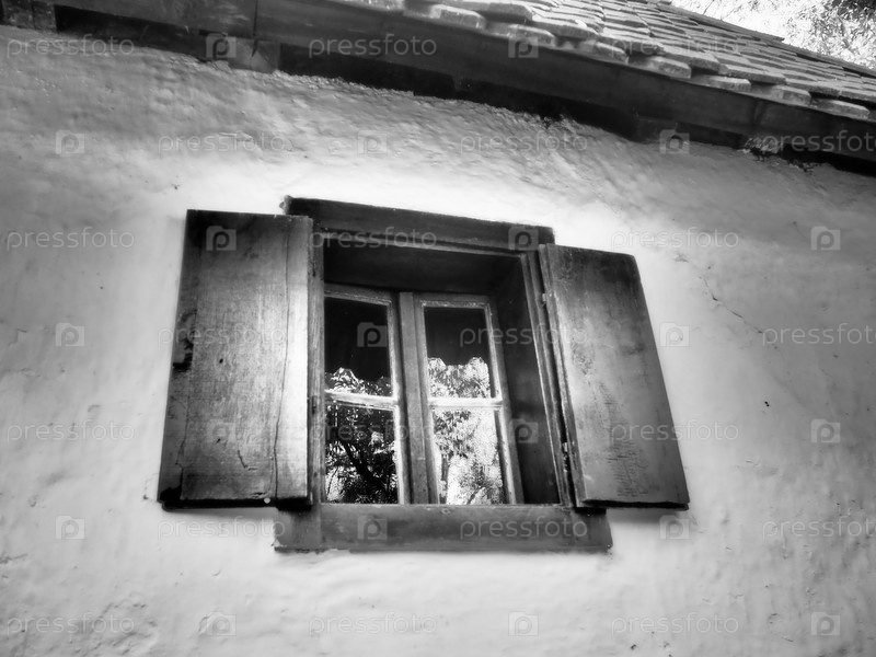 Старые деревянные ставни открыты. Деревянные оконные рамы и ставни. Копирование пространства. Белая бетонная стена. Традиционная деревенская архитектура. Домашний крестьянский быт. Юго-Восточная Европа, Сербия